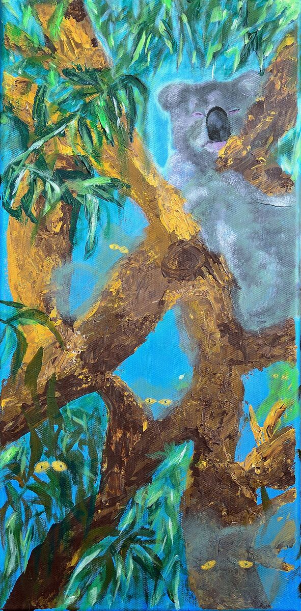 There's not a lot of story with this one. I just saw a koala in a tree surrounded by the little ones that didn't make it in the bushfires a couple of years ago watching over the ones that did, they aren't sad like we are when we think about it, just the same vibe they had before passing, chill. There is quite a bit of texture in this piece, even under the varnish.