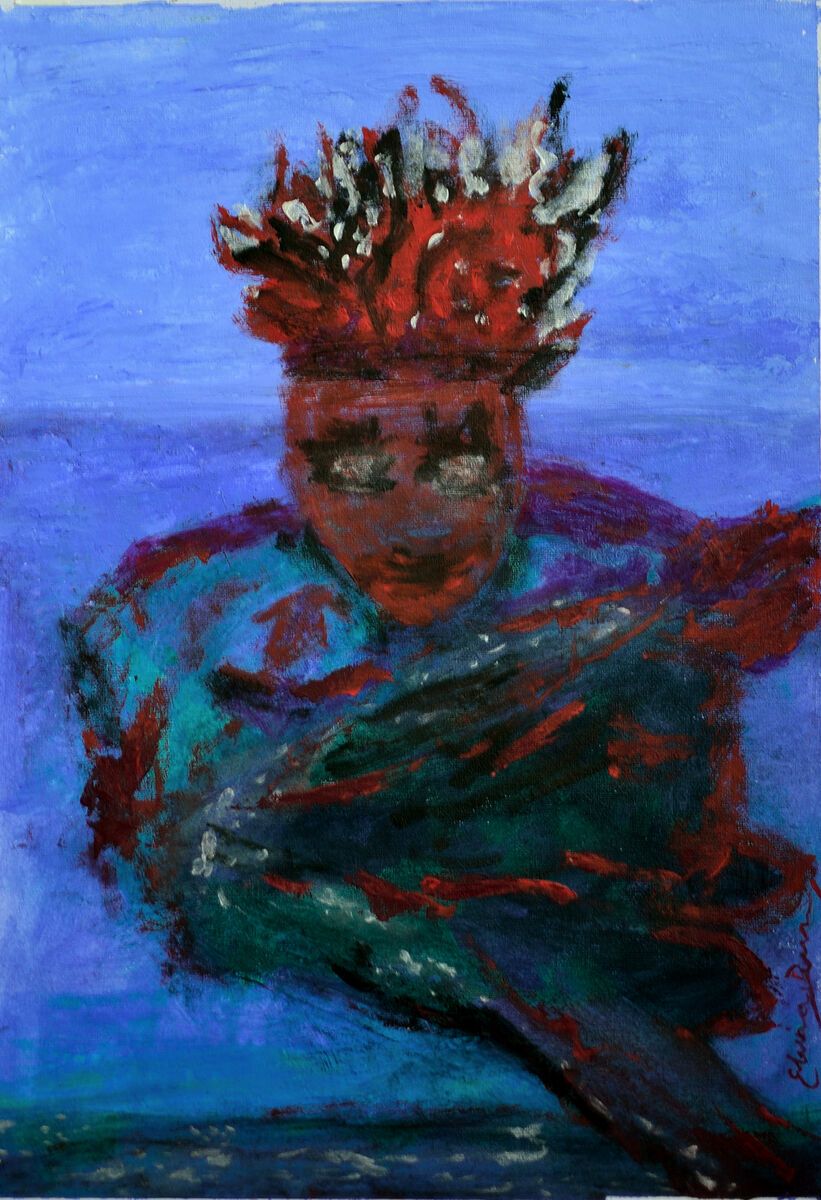 It started with a woman who caught a big fish and she had fiery red hair and I laid down the first layer and left it to dry. I came back later and it was this pseudo whirlpool in the center of the ocean part in I could visualize fish swimming into this current and becoming stuck in the whirlpool. I just kept laying down paint and features of a face started to evolve, just a swipe here and there and it became lips, not intentionally and soon this whirlpool in the ocean became a big fiery one; One that was a part of the ocean as she sent her flames into the air. I thought of Pele, but I wasn't sure what she had to do with the ocean and whirlpools of fish?
