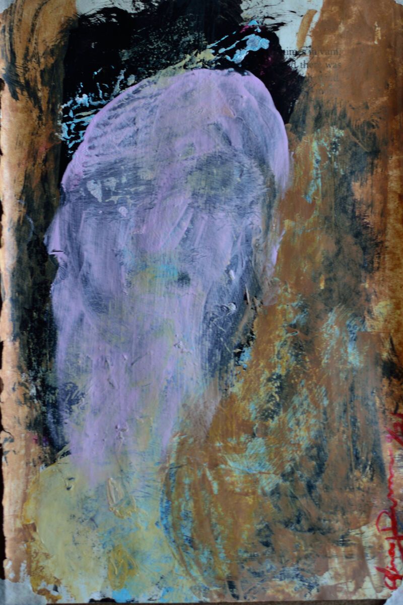 The wonder of intuitive art! This piece was part of a study series, and while it was felt a head, the actual facial features appeared without planning or intention due to the paint underneath. I thought this was fantastic, why I love abstract and intuitive art, however then taking photos, I notice that here is a face to the side also. It just depends on your perspective! This magical little study i could never replicate if I tried. It is only student quality acrylic paint on an old book page