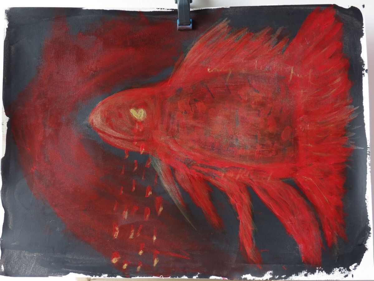 On the day this fish was created, I just knew I had to paint a fish and I started with the standard ellipse shaped style, thinking it was just going to be about color and as I started painting it began to paint itself. The wondrous ( and sometimes annoying) thing about true intuitive painting is that you usually never see the end piece only a tentative idea and it doesn't present itself, it unfolds as you paint. The ellipse turned into a square almost and the colour change aspect felt like a requirement. After finishing I thought it look the weirdest thing, but that was ok, I like my style to be different from the rest, and made the Instagram post about it being a lesson on perspective and how 2 people looking at the same thing can see something completely different depending on where they stand on something. This case, the fish changes from red to a Gold depending on where they stand on the floor, but feelings and rigid pre conceived ideas, social circles and education also change the way we see things and the way we are; Like the fish, I will come to learn, humans are mostly are products of their environment. (the rest of the story is here: Elvina.elvinadunn.com )