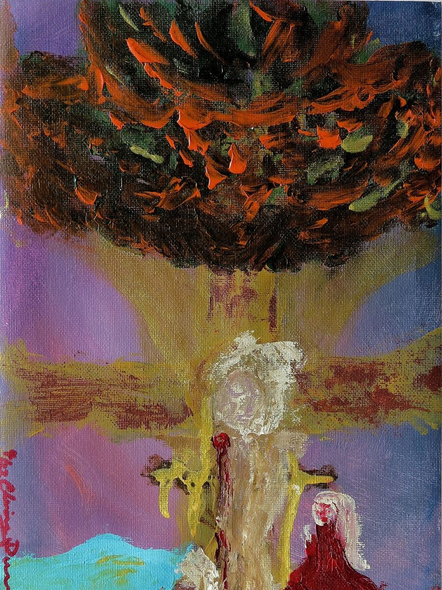 I felt pushed to do an artwork Easter Themed. It was going to be for Easter Sunday but somehow got turned into a world tree of life and how Jesus sacrificed himself to it for the worldly Mary whilst the heavenly Mother was at his feet in despair, The only blood on the spear that went into his right shoulder was red, red like worldly Mary and it was sucked into the tree of life while the pure spirit fell back into the Mother from where it came was gold. There are lots of small things I discovered in this painting but the most magical, divine thing was that when I wiped the middle from something I didn't like, this face appeared. one wipe and it was there. This is the MOST special One thus far, and not just from a face being there * I am getting shivers writing this* but that the face is looking down on worldly Mary with such a flooring expression.