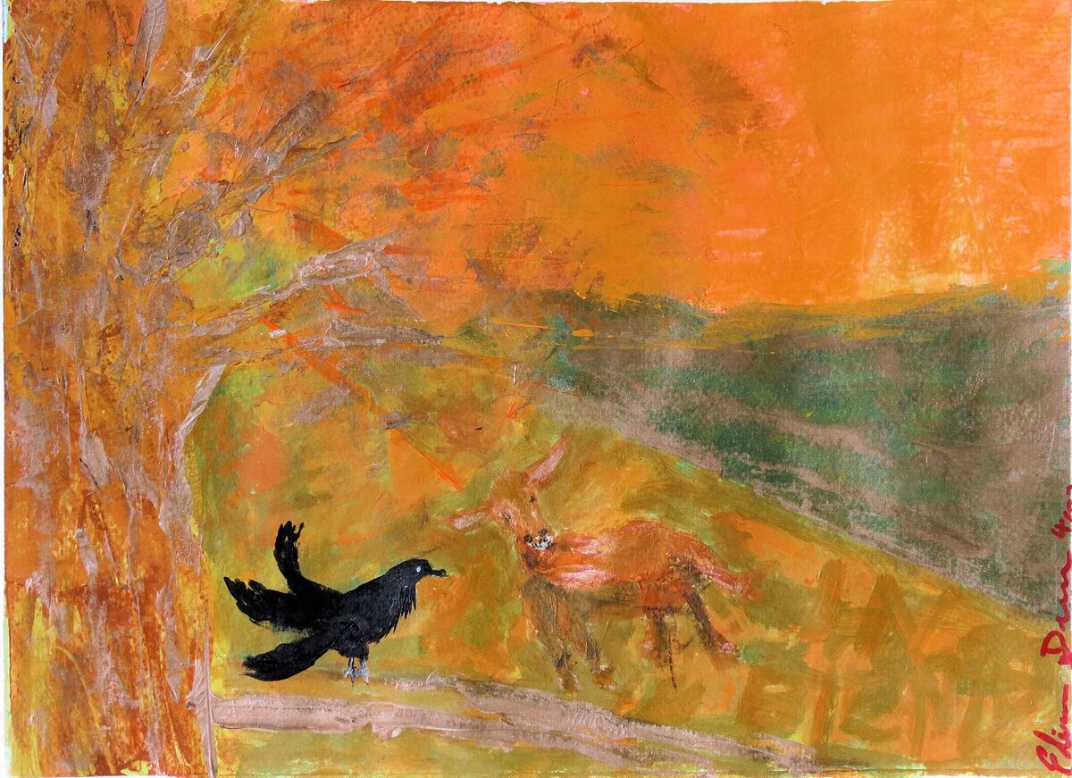 This started years ago as a pastel scene and it came from sitting parked on the side of the road near a farm and watching a young cow and crow interact. IT was like they were talking with each other, these sweet little animated movements like one would do to another mid conversation. Years later, I pull it out again and I see it more as, that while a stunningly beautiful scene, backdrop and animals, I may never have even noticed that ONE cow and ONE crow, but rather than as a PART of the scene, it was only that they were conducting this magical discourse in front of me that the beautiful scenery fell away and they came into view. And I thought it's like us...we are only seen when we are something different, good or bad, it's the difference that people notice. acrylic on paper with metallic accents