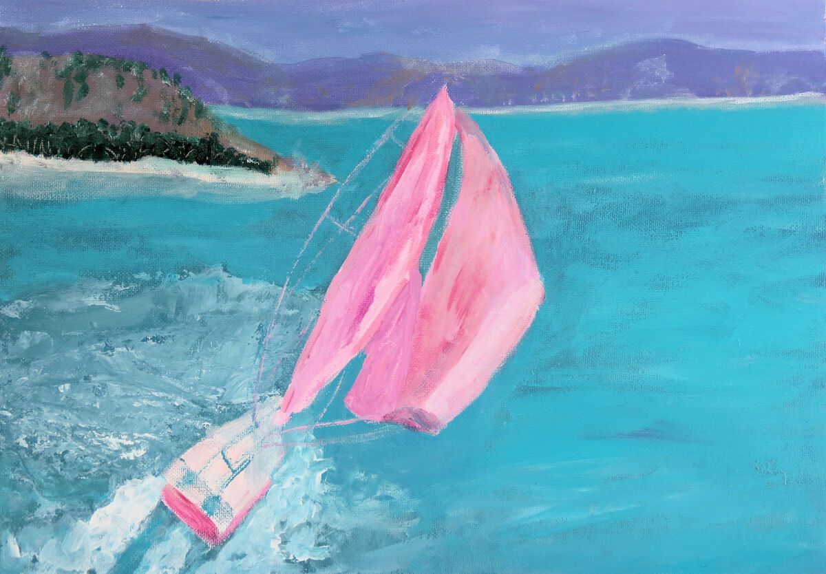 There is no real story to this. I was inspired by the Whitsundays in Queensland Australia and how gorgeous the Autumn sunsets looked on the yachts in the bays, and kind of combined them both. The beauty of art as opposed to a photo is you can make it whatever you want it to be rather than what is captured. I wanted the color play of the gorgeous sunsets on glistening sails whilst also having that gorgeous blue of the waters of paradise.