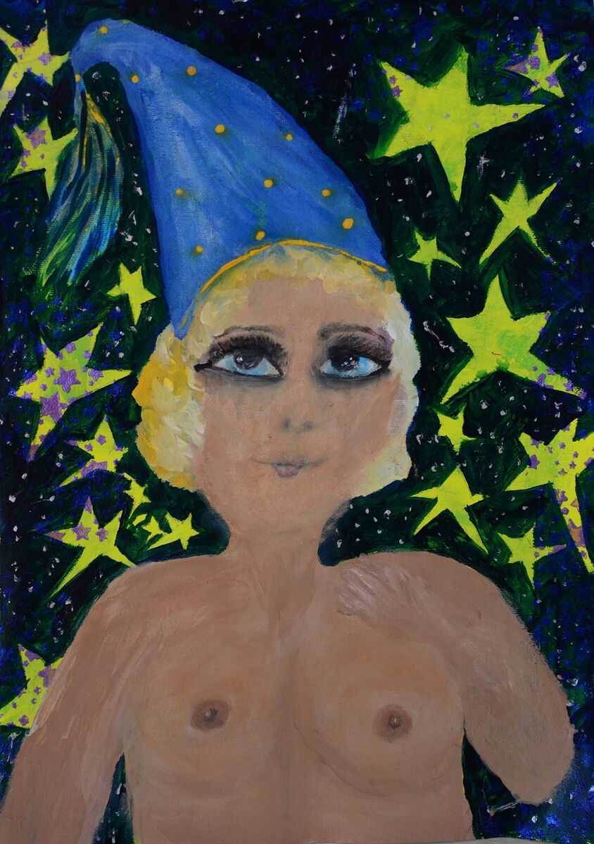 Old time glamour, a face coming out from the shadow of the past into the light of the future with stars shining in her eyes.