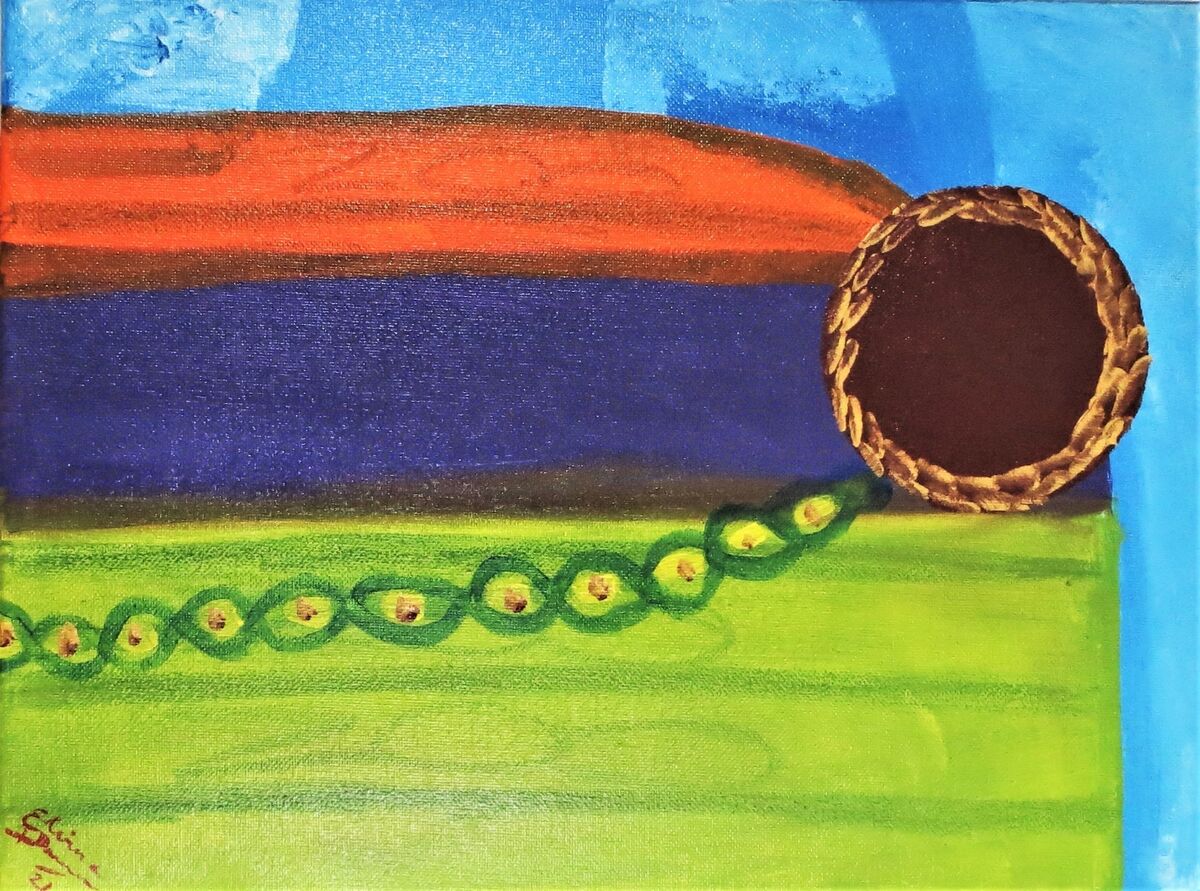 I started this piece and I heard "blue Zoo' as the first thing to come into my mind and it represents all the beautiful color, though very different are all behind the bars of being human, that we all have so many common denominators that it's ludicrous to, like a zoo, separate and define humanity in that way. Chains or DNA connected to the award of blood that flows through all our veins, we are one under a heavenly canopy yet still behind the bars of perception.