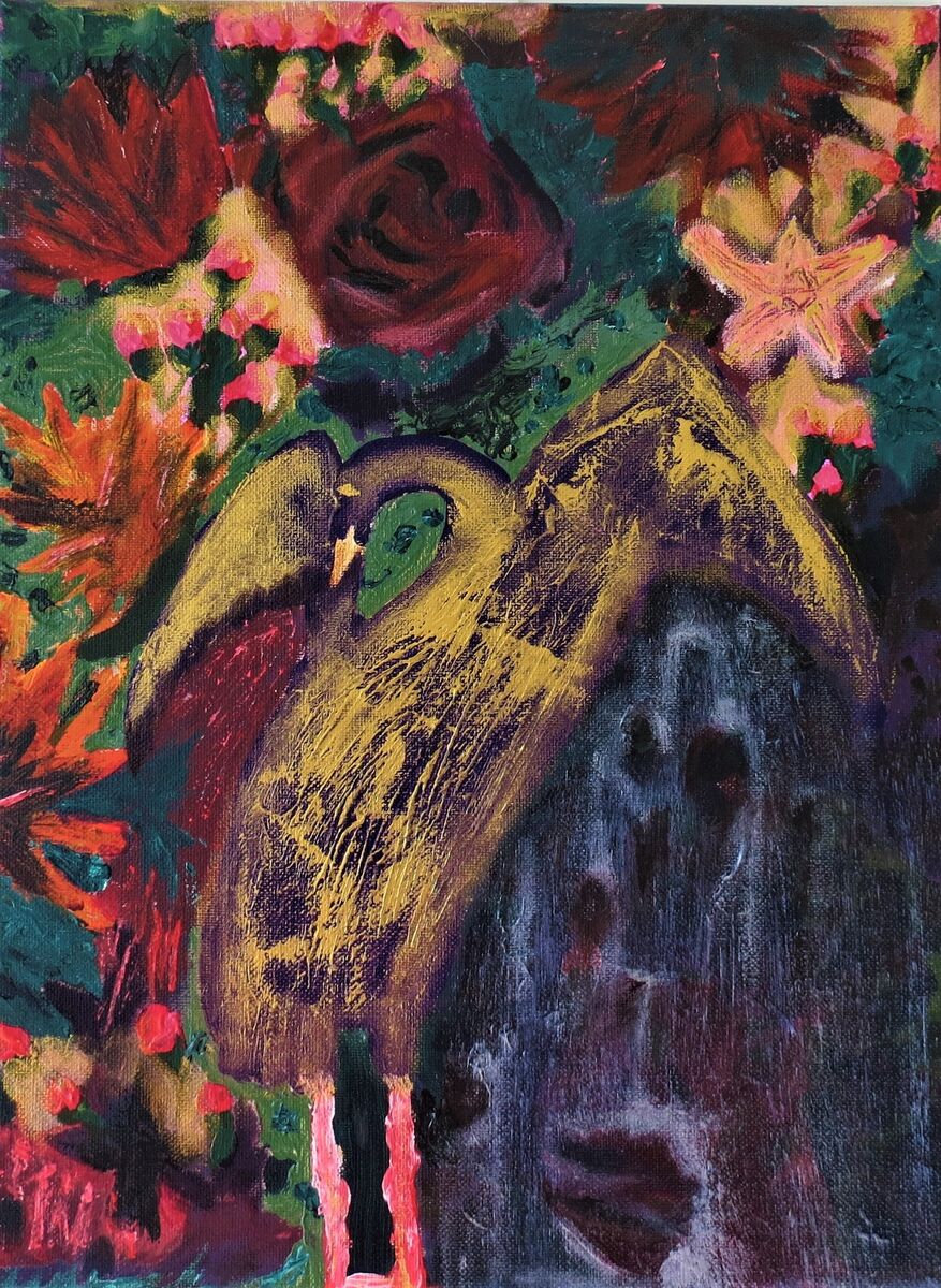 There is so much happening in this piece what is noticeable and what is not. Souls coming out of the cave like rosebuds leaving the shelter of the leaves that cradle them like a butterfly exiting it's cocoon excited about it's journey through a new vessel, a new life. The conduit gathering them up under her wing, like hungry moths they assemble under her wing drawn by her radiant light where they unfold into their unique, wondrous bloom. And after they grow and live and transform, it's time to start again and they fold into the stars where through her grace The golden stork reaches up and cradles them again as she accompanies them on their journey back to the cave, silvery stardust raining down into the well of creation. There are many more little things for those that can see them. I personally love the way that the lovers manifested on the side in the crook of the storks neck, as if they assist the stork in the delivery. Different angels different lights. They are so exciting to me finding these unintentional things.
